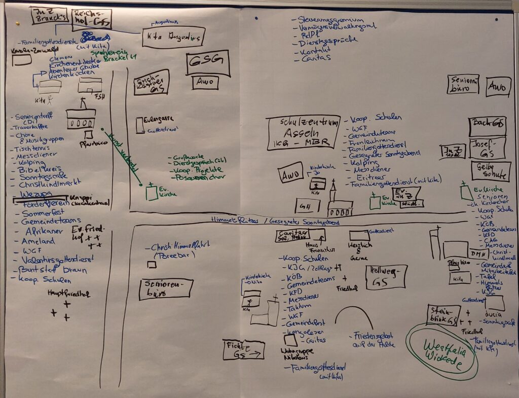 Ein weiterer Schwerpunkt lag auf den vorhandenen Ressourcen der Pfarrei. Die Teilnehmenden trugen zusammen, an welchen Orten und zu welchen Zeiten die Pfarrei bereits aktiv ist – etwa zu besonderen Anlässen im Kirchenjahr oder bei verschiedenen pastoralen Angeboten. Dabei wurde auch reflektiert, wie zufrieden man mit dem derzeitigen Einsatz von Zeit, Menschen und finanziellen Mitteln ist. Auf einer gemeinsamen „Landkarte“ der Pfarrei wurden Orte des Engagements sichtbar gemacht und ergänzt durch einen Zeitstrahl mit bestehenden Aktivitäten im Jahresverlauf. Auf dieser Grundlage diskutierte der Rat anschließend Zukunftsperspektiven: Wo und wann braucht es im Dortmunder Osten besonders „Engel“? Wo sollte Kirche künftig stärker präsent sein? Welche Angebote sollen weitergeführt, neu entwickelt oder auch beendet werden? Aus den gesammelten Ideen wurden Schwerpunkte gebildet und erste konkrete Projekte skizziert. Dabei wurde stets geprüft, welche Ressourcen dafür zur Verfügung stehen und wie diese sinnvoll erweitert oder neu eingesetzt werden können. Zum Abschluss wurden Verantwortlichkeiten vereinbart und erste Schritte zur Umsetzung festgelegt.Der gemeinsame Tag endete mit einer Reflexion, Rückmeldungen aus der Runde und einem Segensgebet. Die Teilnehmenden nahmen viele Impulse mit und wollen die gewonnenen Ideen nun in die weitere Arbeit der Pfarrei einbringen.